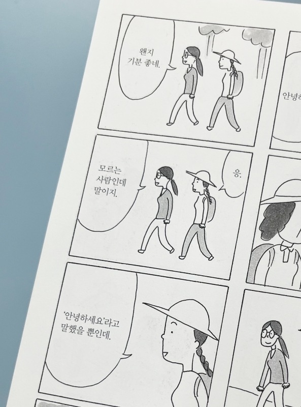 마스다 미리의 만화 <주말엔 숲으로> 속에 등장한 컷이에요. 산에서는 등산객들끼리 인사를 나누는 문화가 있다고 해요. 숲을 걸으며 처음으로 모르는 사람과 '안녕하세요'하고 인사를 나눈 주인공과 친구의 대화예요. 여러분은 모르는 사람과 자주 인사를 나누고 있나요?